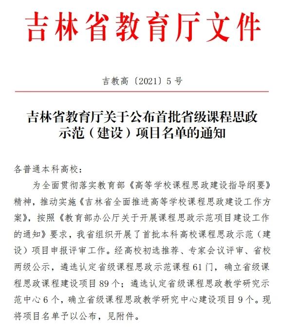 近年来,学校深入贯彻落实《高等学校课程思政建设指导纲要》(教高〔2020〕3号),根据中共吉林省高校工委、吉林省教育厅《吉林省全面推进高等学校课程思政建设工作方案》(吉教高〔2020〕25号)等文件要求,全面推动课程思政改革,强化课程思政建设水平,学校出台了《德赢AC米兰官网“课程思政”教学改革试点工作方案》《德赢AC米兰官网全面推进课程思政建设工作实施方案》等文件,开展了“学科育人示范课程”“课程思政示范(建设)项目”“课程思政教学研究项目”“课程思政教学案例库”等一系列建设工作,深挖各类课程的思政育人功能,提升立德树人成效和人才培养质量。